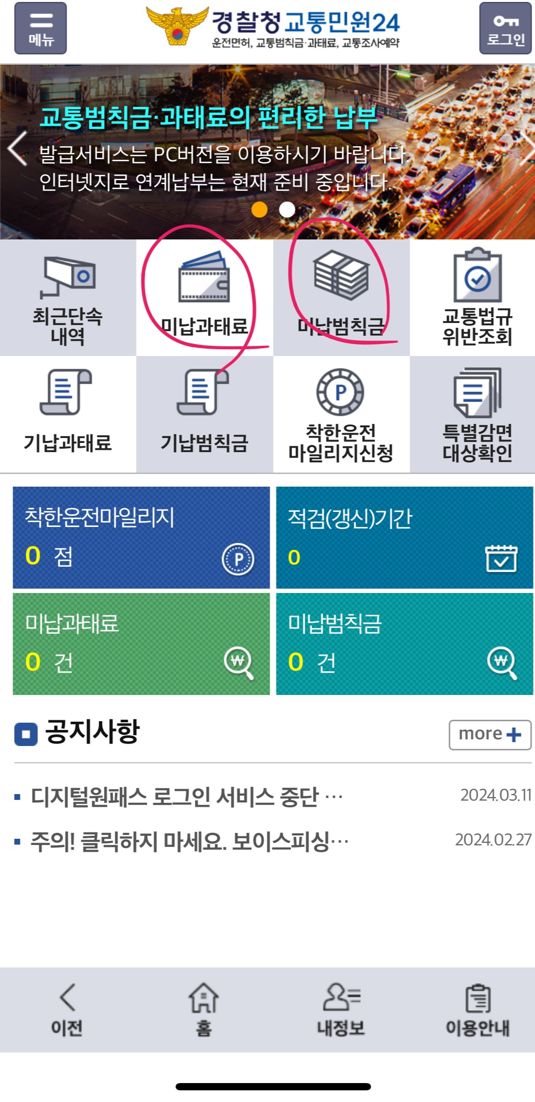사이트나 어플을 이용하여 '경찰청 교통민원24'에 접속하시면 메인 화면에 미납과태료, 미납 범칙금 모두 확인할 수 있습니다.